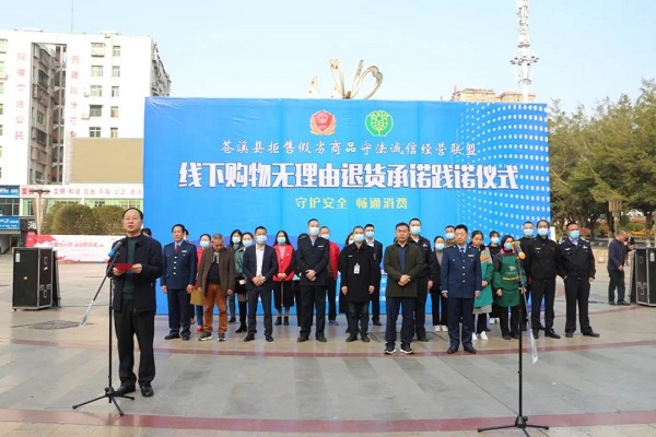 为进一步拉动内需、扩大消费,不断满足广大消费者对美好生活需求。3月15日,我县拒售假劣商品守法诚信经营联盟线下实体店购物无理由退货承诺践诺仪式在同心广场举行,标志着该县线下实体店无理由退货试点正式启动。